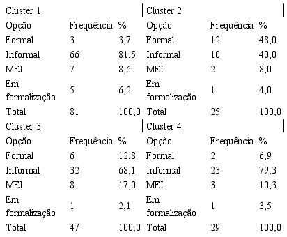 Na avaliação dos negócios apoiados com o microcrédito, pôde-se perceber que se constituem na atividade econômica principal. Entretanto, há uma parcela significativa em todos os clusters de clientes que possuem outras ocupações. Em três grupos houve o predomínio de negócios informais, à exceção no segundo aglomerado, no qual predominam empreendimentos legalizados ou microempreendedores individuais.