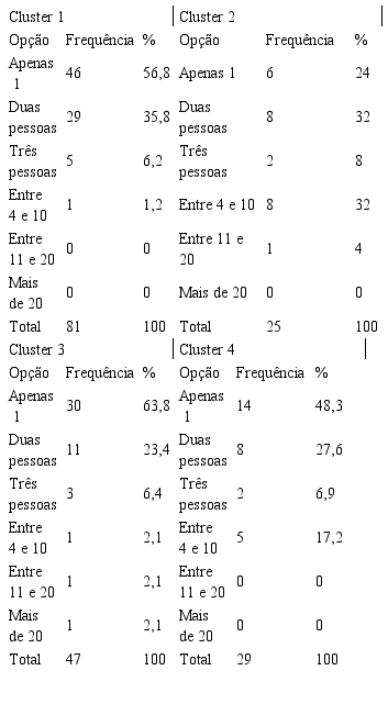 O Quadro 9 apresenta a quantidade de pessoas que trabalham nos empreendimentos. Outra vez, o cluster 2 se destaca tendo 76% dos negócios como geradores de empregos, fato que também pode ser explicado pela melhor estruturação do negócio, pelo maior nível de escolaridade dos proprietários e pelo maior faturamento médio. O agrupamento 4 também mostra uma maioria (52%), em que trabalham mais de uma pessoa. Já os conglomerados 1 e 3 são compostos majoritariamente por trabalhadores individuais.