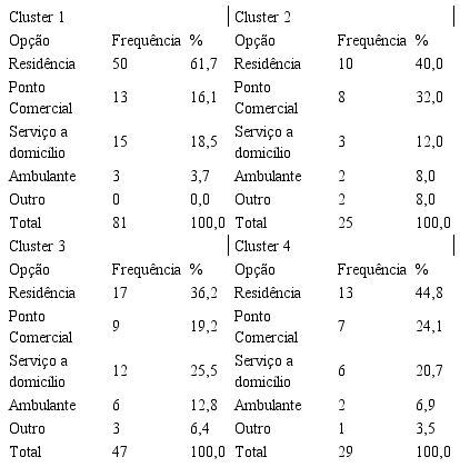 O local de funcionamento dos negócios pode ser verificado no Quadro 10. Em todos os clusters, a opção majoritária é de micronegócios que funcionam nas residências dos empreendedores. Observou-se durante a realização da pesquisa que uma parcela significativa dos usuários é composta por revendedores de cosméticos, manicures e produtores rurais, que têm como local de trabalho suas próprias moradias. Já a existência de ponto comercial é mais notada no grupo 2, em que 32% dos respondentes afirmaram que o possuem.