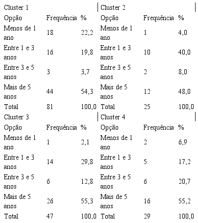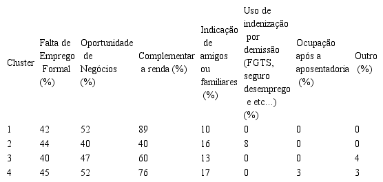 A Tabela 2 corresponde à questão sobre as motivações para se iniciar o negócio. Como, muitas, vezes os objetivos são múltiplos, foi permitida a marcação de mais de uma alternativa. A opção majoritária nos clusters 1, 3 e 4 corresponde à “complementação de renda”. Isso é explicado, pois nesses agrupamentos há um elevado percentual de empreendedores que têm a atividade em tela como sendo complementar. Já no conglomerado 2, em que 88% têm a atividade como principal fonte de renda, há um equilíbrio entre as opções sobre falta de emprego formal, oportunidade de negócios e complementação de renda. Contudo, não é possível distinguir claramente se o empreendedorismo na região ocorre mais por oportunidade ou por necessidade, uma vez que em todos os grupos há um equilíbrio nessas alternativas.