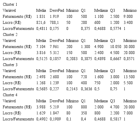 Devido à grande informalidade e à baixa escolaridade, não é surpresa que em todos os grupos os empreendedores não possuam um controle financeiro capaz de discriminar as receitas e as despesas provenientes dos negócios. Entretanto, em relação ao faturamento e ao lucro, foi encontrada uma grande heterogeneidade entre os grupos. Como esperado, é no conglomerado 2 que esses indicadores apresentam maiores valores médios.