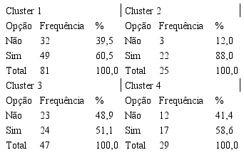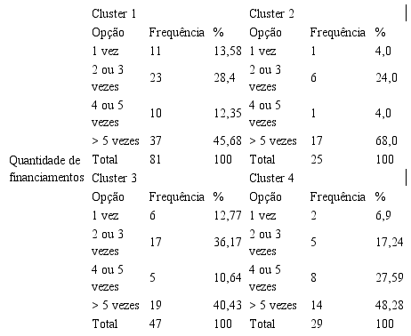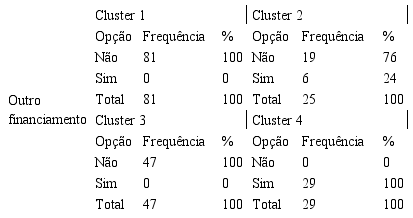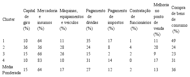 A questão sobre a aplicação dos valores levantados nos financiamentos possibilitou aos respondentes a escolha de mais de uma opção, uma vez que o uso não se limita a uma só alternativa. O resultado pode ser visto na Tabela 4. Em todos os grupos, a variável relativa à compra de mercadorias e insumos teve maioria. Entretanto, no cluster 2 ela não foi absoluta. Nesse mesmo conglomerado, é possível notar maior equilíbrio nas respostas. Porém é importante ressaltar pelas análises anteriores que nesse segmento encontram-se os negócios financeiramente mais desenvolvidos e a maior escolaridade média dos empreendedores.