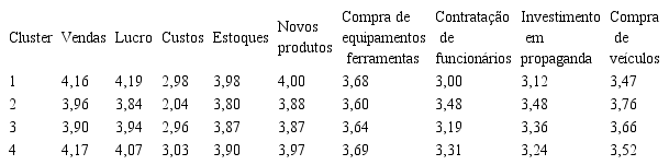 Em relação ao valor apurado com as vendas e o lucro obtido, em todos os clusters a média ficou próxima de 4. Isso demonstra que os empreendedores perceberam uma melhora nesses itens. Porém, em relação aos custos, os grupos 1, 3 e 4 definiram que não houve alteração nesse quesito. Já o segundo agrupamento percebeu uma piora, uma vez que, após a aquisição dos empréstimos, os custos aumentaram.
