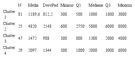 Uma vez definida a quantidade de conjuntos, elaborou-se o dendograma, bem como a divisão dos agrupamentos. O primeiro grupo foi definido com 81 observações, o segundo, com 25, o terceiro, com 47, e o quarto, com 29 elementos. A Figura 3 mostra a separação nos quatro grandes compostos de dados.