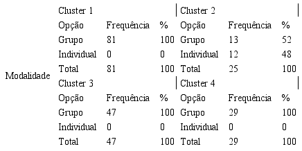 Em relação à modalidade de financiamento adquirida no último contrato (Quadro 2), é possível notar a predominância de empréstimos em grupo. Nos clusters 1, 3 e 4, há somente esse tipo, e o individual aparece somente no grupo 2. Uma vez que o segundo conglomerado é composto por desembolsos maiores (Tabela 1), pode-se concluir que os financiamentos pessoais são disponibilizados com valores mais elevados.