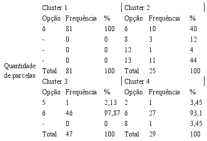 Nos programas de microcrédito, os contratos costumam ser de curta duração e com pagamentos regulares com intervalos pequenos entre uma parcela e outra. Por isso, é importante analisar o do tamanho do tratado de financiamento. Os clusters 1, 3 e 4 são compostos somente por empréstimos adquiridos por Grupo Solidário, diferenciando do agrupamento 2, de quem possui os dois tipos. O número de parcelas em cada conglomerado pode ser observado no Quadro 5. Entretanto, é importante ressaltar que na observação direta, realizada na agência Capelinha do Crediamigo, e nas entrevistas semiestruturadas foi notada a existência de contratos de seis meses para financiamentos em grupo e de treze meses para empréstimos individuais. Logo, é possível ter ocorrido erro por parte dos respondentes que marcaram as opções de 2, 5, 8 e 12 parcelas.
