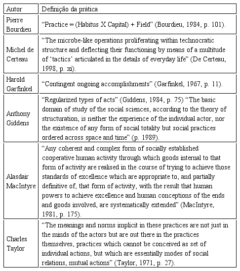 Para Reckwitz (2002), o rótulo prática e prática social remete a diversos autores com afinidades e diferenças. Schatzki (2001) também afirma que não existe uma teoria unificada da prática. Há um consenso entre pesquisadores de que as práticas se referem a um arranjo de atividades corporificadas, conectadas por objetos naturais, híbridos e/ou artefatos, compartilhadas por meio de um entendimento prático e perpetuadas por uma performance contínua (Schatzki, 2001; Reckwitz, 2002; Soares & Bispo, 2017). Assim, apesar das diferentes percepções, existem elementos e noções em comum (Soares & Bispo, 2017).