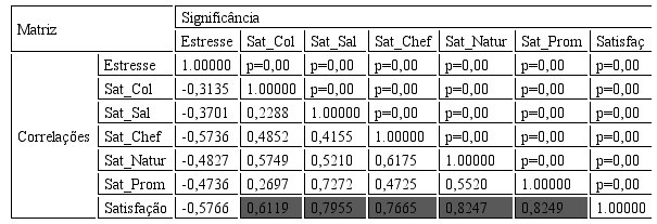 Buscando verificar a existência de correlação entre a satisfação no trabalho, suas dimensões, e o estresse ocupacional, as mesmas foram submetidas a um tratamento estatístico com o teste de correlação paramétrico de Pearson, conforme apresentado na Tabela 2.