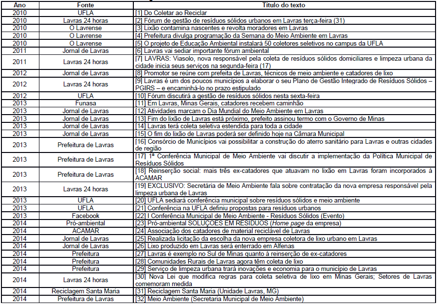 Para a realização desta pesquisa estipulamos palavras de busca relacionadas ao tema em destaque: Lavras (delimitação do município); resíduos sólidos; lixo; lixão; política nacional de resíduos sólidos; material reciclável; reciclagem; prefeitura; catadores de materiais recicláveis e meio ambiente. Determinou-se como período de busca (de publicação do texto) de janeiro de 2010 (ano de publicação da Lei nº 12.305; PNRS) a 2014. Os resultados (dados) estão presentes na Figura 1, destacando o ano, fonte (local do texto) e título do texto.