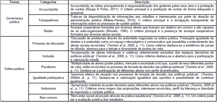 Para o tratamento dos dados, optamos por usar a análise de conteúdo qualitativa (Vergara, 2005) como a principal ferramenta de sistematização e interpretação. Este processo consistiu em uma análise de categorias (não mutuamente exclusivas) da governança pública e da esfera pública, conforme Figura 2. As categorias da governança pública adotadas se referem a accountability, transparência e redes (Rhodes, 1996; Baracho, 2000; Matias-Pereira, 2010; Alcântara, Silva,& Pereira, 2014). Para a esfera pública foram utilizados os critérios de avaliação de processos deliberativos de Tenório et al. (2008), que são coerentes também, em parte, com os critérios de avaliação da deliberação online de Sampaio, Barros e Moraes (2012).