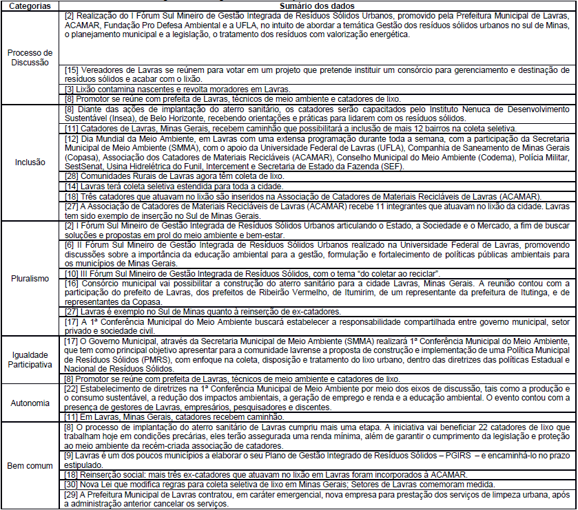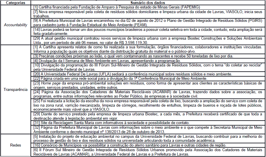 As categorias teóricas associadas às notícias que tratam sobre a gestão de resíduos sólidos no município estudado demonstram que elementos da esfera pública e da governança pública podem ser evidenciados na prática. Mesmo assim, em Lavras, a PNRS apresenta atrasos em sua implementação. Os municípios de todo o país tinham até dois de agosto do ano de 2014 para regularizarem suas situações em relação ao lixão, todavia, a prática está atrasada em muitas cidades.