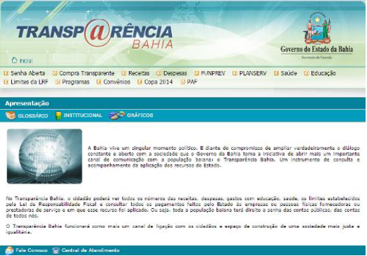 Dentre os cinco Estados avaliados, o site da Bahia recebeu a pior nota, apesar de apresentar ligeira evolução em relação à pesquisa de Sales (2012) no item informações ao cidadão.