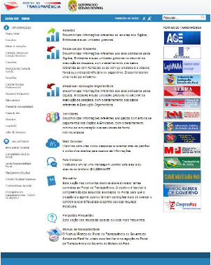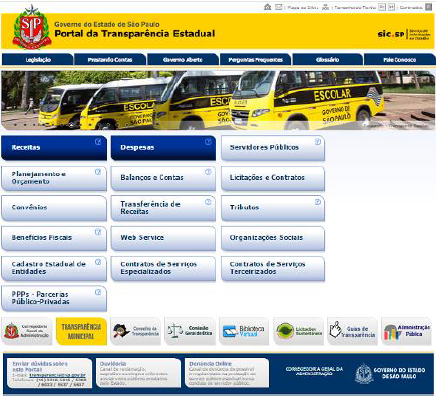 O portal da transparência do Estado de São Paulo, unidade da federação com maior participação no PIB nacional e representante da região sudeste na pesquisa, se organiza principalmente por meio de blocos distribuídos em linhas e colunas, postados na parte mais central da página. Acima, um menu de links com destaque menor, abaixo, banners com links para órgãos com atuação associada à transparência governamental.