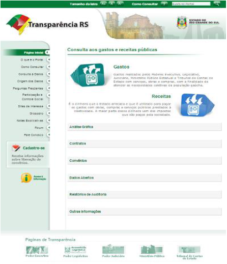 O Rio Grande do Sul é o estado da região mais meridional do país com maior participação no PIB nacional. O seu portal de transparência apresenta uma interface simplificada, com duas áreas mais destacadas. À esquerda, encontra-se o menu principal com links para conteúdos como O que é o Portal, Como Consultar, Origem dos Dados, Perguntas Frequentes, Participação e Controle Social e outros. À direita, estão localizados os destaques e os acessos diretos aos gastos e receitas, além de itens como convênios e contratos.