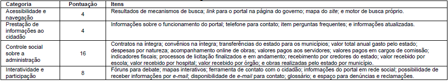 A segunda abordagem fundamenta-se na adaptação de uma escala avaliativa desenvolvida por Sales (2012) com o objetivo de verificar se os portais de transparência dos estados se apresentam como instrumentos efetivos para o exercício do controle da atividade pública, reduzindo, assim, o distanciamento entre governo e cidadãos. Sales (2012) desenvolveu seu instrumento com base nas pesquisas anteriores de Lemos et al. (2004) e Gomes (2005). De Lemos et al. (2004), Sales (2012) apropriou a avaliação da dimensão técnica dos portais, representada no instrumento pela categoria “acessibilidade e navegabilidade”. Já do trabalho de Gomes (2005), Sales (2012) incorporou três categorias ligadas à cultura política, controle e avaliação da potencialidade interativa dos portais: “prestação de informações básicas ao cidadão”, “controle social sobre a administração” e “interatividade e participação”. Cada uma dessas dimensões é chamada por Sales (2012) de grau, pois representam níveis no processo de transparência, do mais básico ao mais avançado.