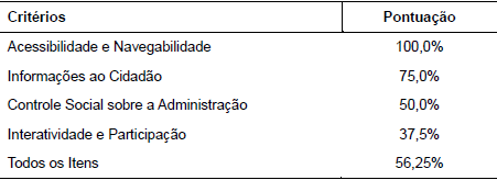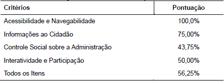 A acessibilidade e navegabilidade são o ponto forte do site, atingindo o percentual de 100% nos itens avaliados, como pode ser observado na Tabela 2. O ambiente virtual tem motor de busca próprio, ainda que por vezes a pesquisa tenha retornado falhas nos resultados, e apresenta o mapa do site, o que facilita a localização dos elementos que compõem a página. Dos portais, é o que possui maior destaque na página do governo ao qual faz parte, tendo um banner na área nobre direcionando para a página da transparência.