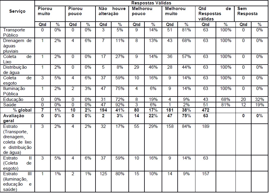 Analisando os dados, percebe-se que emergem três padrões de respostas. O primeiro padrão (Estrato I) é composto pelos serviços de transporte público, drenagem de águas pluviais, coleta de lixo e distribuição de água. Estes serviços, em termos da percepção de qualidade pelos cidadãos, caracterizam-se por uma expressiva melhora na qualidade. O segundo padrão (Estrato II) é composto pelo serviço de coleta de esgoto. Este serviço, em termos da percepção de qualidade, caracteriza-se por uma divisão na percepção dos cidadãos: alguns consideram que o serviço melhorou (30% dos respondentes), e a maioria considera que não houve alteração na qualidade do serviço prestado (59% dos respondentes). O terceiro padrão (Estrato III) é composto pelos serviços de iluminação pública, educação e saúde. Estes serviços, em termos da percepção de qualidade, caracterizam-se pelo predomínio de respondentes que consideram não ter havido alteração (75% para iluminação pública, 72% para educação e 92% para saúde).