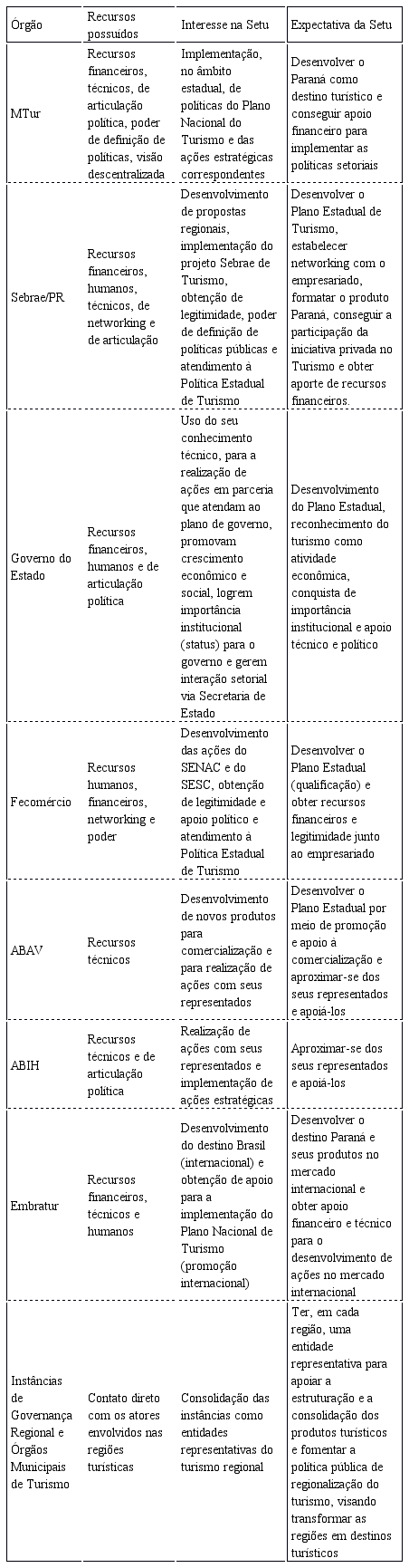 A estruturação do setor turístico paranaense ganhou espaço em políticas públicas estatais a partir da década de 1940, quando se iniciou o processo de formalização institucional. A Setu protagoniza a quinta fase, vigente no momento da coleta de dados. No período compreendido entre 1943 e 1995, os stakeholders do órgão gestor do turismo eram internos ao poder público, instituições criadas pelo próprio Estado, cuja finalidade era a atuação de mercado. A partir de 1995, o cenário mudou, e setores da sociedade passaram a se envolver em órgãos colegiados. Constituído em 2003, o MTur convocou os órgãos públicos estaduais responsáveis para se organizarem conforme as diretrizes então instituídas . Os novos arranjos estaduais consolidaram, pela via normativa, a participação da sociedade na gestão turística. A análise de stakeholders passou a ser, assim, fundamental para a gestão do órgão.