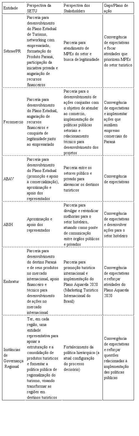 Pela análise da literatura, nota-se haver ainda alguma insuficiência no que tange à análise de stakeholders em órgãos públicos de turismo. Vale ressaltar que as pesquisas em órgãos públicos do turismo tem caminhado no sentido de explorar a relação de intergovernabilidade dos entes (Emmendoerfer et al., 2012). Nesse contexto, a pesquisa relatada neste artigo explora, em profundidade e sob via bidirecional, as relações mantidas entre a Setu e seus principais stakeholders. Visa-se preencher lacunas do campo da estratégia, dada a carência de estudos sobre gestão turística e, especificamente, sobre a atuação de stakeholders (Vieira, Costa, & Cintra, 2012).