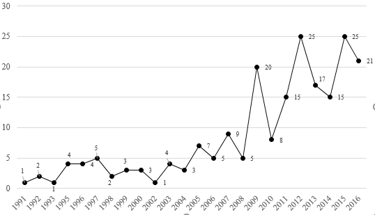 Quanto ao volume de produção, é possível identificar um crescente aumento ao longo do tempo, sobretudo quando considerados os primeiros anos, como se observa na Figura 1. É possível notar que a partir de 2008 houve um aumento considerável na quantidade de publicações, passando de 9 em 2007 para 25 em 2012. Isso indica que o tema tem atraído cada vez mais a atenção de pesquisadores, do modo que é possível esperar o aumento dos estudos nos próximos anos.