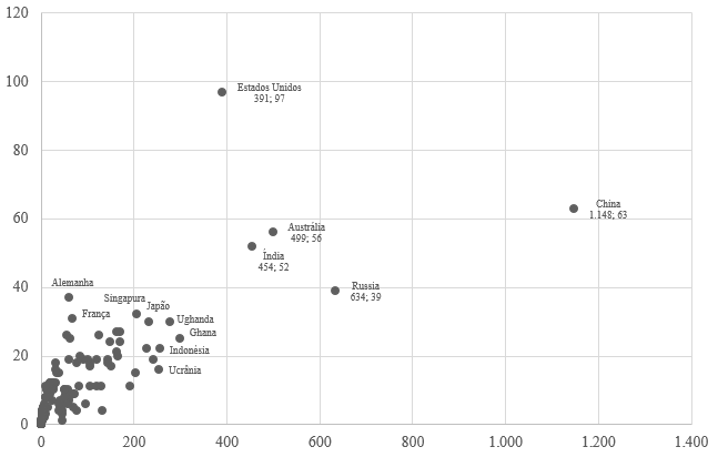 Com base nos aspectos regionais, a análise quantitativa buscou, ainda, identificar os países que tiveram mais citações dentro da amostra, considerando para isso a quantidade de incidências por artigo, ou seja, se o país foi muito citado e se esse número de citações está concentrado em poucos ou muitos artigos. A Figura 2 mostra a dispersão entre a quantidade de citações (eixo X) e a quantidade de incidências (eixo Y). Como se observa, a China (1.148; 63), embora seja um país muito citado, há uma concentração dessas citações em uma quantidade relativamente pequena de periódicos, quando observada a amostra total do estudo (211 artigos). Por outro lado, os Estados Unidos (391; 97) são citados em diversos artigos. Austrália, Índia, Rússia, Alemanha, Singapura, Japão, França e Uganda também são países com bastante incidência de relatos.