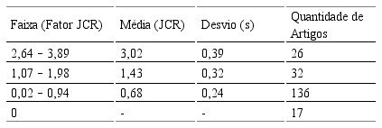 No que se refere à qualidade acadêmica da produção a respeito da corrupção na Administração Pública, considerando o fator de impacto (JRC) dos artigos, a Tabela 1 detalha os resultados encontrados. Grande parte da produção encontrada possui fator de impacto entre 0,02 e 0,94, sendo que apenas 17 artigos apresentavam fator equivalente a zero. Quanto aos periódicos, foram encontradas concentrações em apenas dois: Internacional Journal of Policy Administration and Institutions (n=12; JCR=3,42), e Public Administration Review (n=10; JCR =2,64).