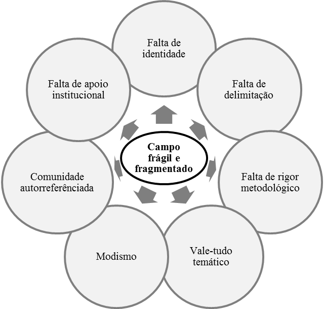Portanto, considerando os estudos realizados até então, por conta de todos os problemas destacados acima, o campo do saber em AP permanece frágil e fragmentado no Brasil, apesar de um crescimento observável de sua produção científica na última década. A figura 1 ilustra, tentativamente, essa problemática como um círculo vicioso.