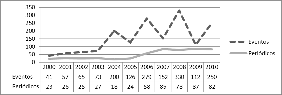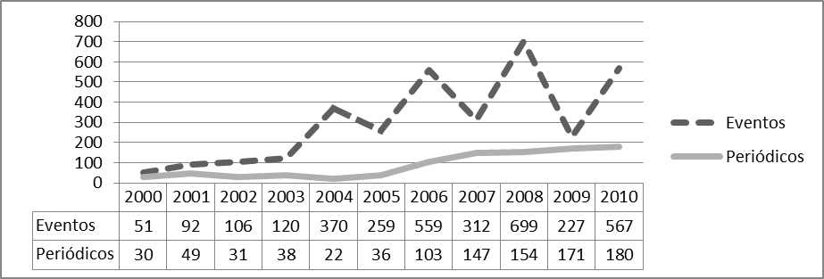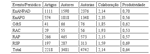 O levantamento da produção científica em Administração Pública nos eventos e periódicos, no período de 2000 a 2010, somou um total de 2.218 artigos na última década, sendo 1.685 publicados em anais dos encontros e 533 nas revistas que compõem a amostra da pesquisa.