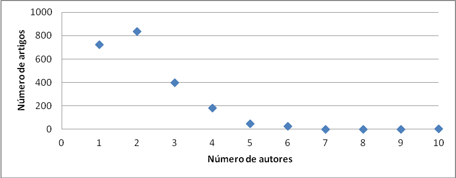 Complementarmente, é possível verificar (gráfico 2) a evolução no número de autores no período 2000-2010: de 81 pesquisadores no ano de 2000 para 747 pesquisadores no ano de 2010. Tal fato demonstra, naturalmente, a simetria entre o aumento do número de artigos e a elevação do número de autores a cada ano. Todavia, a relação direta e proporcional entre o crescimento do volume da produção científica e do número de pesquisadores no campo do saber não revela algo novo, visto que Hocayen-da-Silva et al (2008) e Fadul et al (2011) constataram resultado idêntico, apesar de analisarem horizontes temporais diferentes. Logo, é bem-vindo aprofundar tal análise e calcular, para além do volume da produção científica e do número de pesquisadores, o grau de colaboração e produtividade do campo do saber em AP.