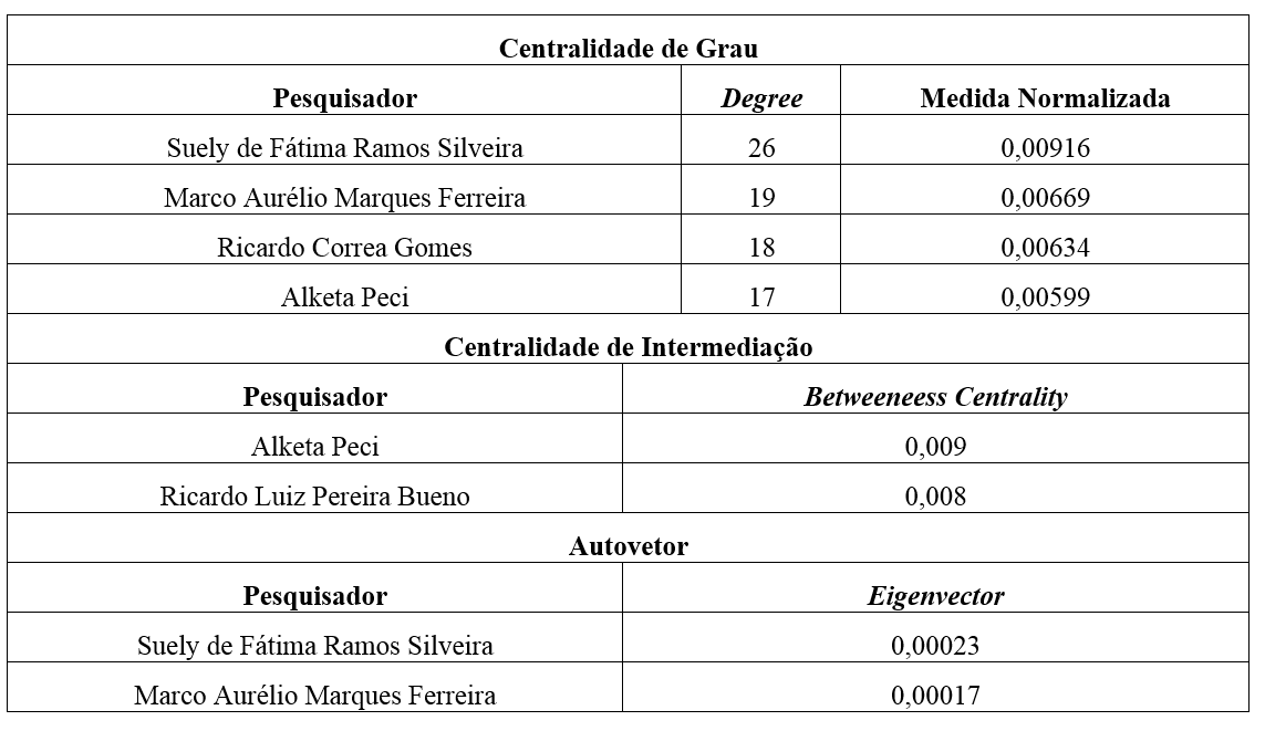 Finalizando, a medida de autovetor destaca a relação, na rede de pesquisa, entre os pesquisadores que apresentam alto valor de associações/conexões, destacando-se as parcerias entre autores colaborativos que trabalham, muitas vezes, no mesmo grupo de pesquisa. Nesse caso, o realce na última década foi para os professores da UFV, Suely de Fátima Ramos Silveira e Marco Aurélio Marques Ferreira.