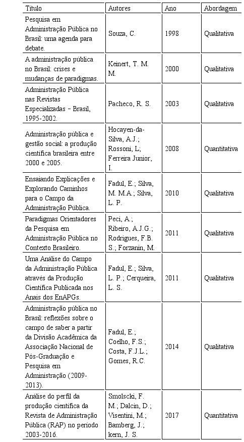 O estudo intenta oferecer dados e informações que dialoguem especificamente com algumas das premissas intuitivas dos trabalhos anteriores, citados na tabela 1, que identificaram elementos estruturantes do campo do saber em AP no Brasil. Em linhas gerais, interpenetrando as leituras de Souza (1998), Pacheco (2003) e Fadul et al (2010), pode-se classificar a produção científica em Administração Pública no país como:
