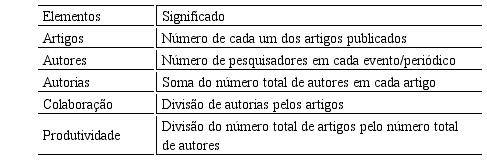 Para o cálculo dos índices bibliométricos de colaboração e produtividade, considerou-se: (a) artigos, o número de artigos publicados; (b) autores, o número de pesquisadores em cada evento/periódico (ressaltando-se, entretanto, que os pesquisadores podem se repetir, uma vez que podem publicar em eventos/periódicos distintos); (c) autorias, soma do número total de autores em cada artigo; (d) colaboração, divisão de autorias pelos artigos e (e) produtividade, divisão entre o total de artigos pelo total de autores, conforme elucidado na seção 3 (quadro 1), e cujos resultados encontram-se na tabela 2, a seguir.