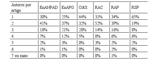 Para além do crescimento do campo do saber em AP na última década, notou-se um padrão colaborativo nas publicações com frequência modal de coautoria entre dois pesquisadores. Dentre os dois eventos e os quatro periódicos que compuseram a amostra desta investigação, apenas a Revista do Serviço Público apresentou um índice de colaboração no qual dois terços dos artigos eram de autoria de um pesquisador, o que é explicado pelo viés profissional da publicação e pelo perfil de practtioners dos autores, geralmente gestores públicos que são mestres ou doutores, que não enfatizam a tradição acadêmica de coautoria.