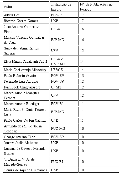 Ainda, vale mencionar que, entre esses 20 autores prolíficos, 12 pertenceram ao comitê científico (ou foram líderes de tema) da área (2000-2008) ou divisão acadêmica de Administração Pública da ANPAD (2009-2017) neste século, bem como alguns são professores sêniores e foram (ou são) editores de periódicos importantes de ADM e AP. Tal fato ilustra a relação crível entre o volume da produção científica do autor e a ocupação de cargos de liderança nas associações de pesquisa e congressos acadêmicos. Em relação às instituições de ensino (IES), 80% dos professores pertencem a IES que têm tradição de longa data no ensino e/ou pesquisa em Administração Pública no Brasil, como FGV-RJ, FGV-SP, UFBA, UFRGS, UFMG, UNB e FJP-MG. Atualmente, pelo cadastro do CNPq (ano base de 2018), um terço desses 20 professores tem bolsa de produtividade em pesquisa na área de Administração.