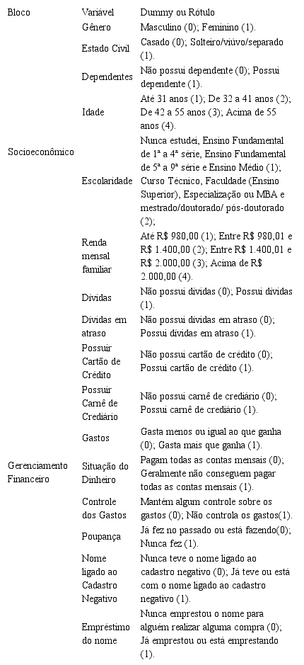 Para a análise dos dados utilizou-se estatísticas descritivas, teste de diferença de média, análise de confiabilidade e testes de hipóteses de associação entre variáveis. Para as análises, foi criada uma variável binária com valor zero (0) para indivíduos classificados como adimplentes no PMCMV e valor um (1) para indivíduos inadimplentes no mesmo programa. As variáveis socioeconômicas selecionadas com base no referencial teórico são apresentadas no Quadro 01.