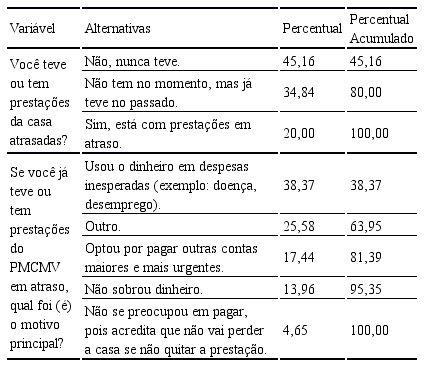A maioria dos entrevistados (54,84%) já teve no passado ou está com prestações da casa atrasadas. O percentual de indivíduos com prestações em atraso no momento da pesquisa foi de 20%. Ao serem questionados sobre o principal motivo para o não pagamento das prestações, 38,37% dos entrevistados afirmaram que o dinheiro foi utilizado em despesas inesperadas, em função de doença ou desemprego e 25,58%, que o motivo foi outro, onde foi destacado o atraso no envio do boleto de pagamento, esquecimento e ainda falecimento de algum familiar. Esses resultados ratificam o que foi encontrado por Lobler et al (2000) e Sehn e Carlini Junior (2007) ao pesquisarem a inadimplência em financiamentos habitacionais anteriores ao PMCMV, em Santa Maria (RS) e em cidades do estado de Pernambuco (PE), respectivamente, o que evidencia a falta de eficiência de cobrança por parte da CEF, a diminuição na renda, descontrole financeiro, doença na família e desemprego como fatores que causam a inadimplência.