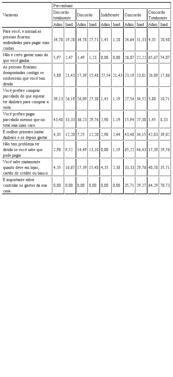As afirmações “não é certo gastar mais do que você ganha”, “não tem problema ter dívida se você sabe que pode pagar”, “você sabe exatamente quanto deve em lojas, cartão de crédito ou banco” e “é importante saber controlar os gastos da sua casa” não apresentaram diferença de média significativa entre os adimplentes e inadimplentes. A grande maioria concorda com as questões “não é certo gastar mais do que você ganha” e “é importante saber controlar os gastos da sua casa”. Quanto ao saber exatamente quanto deve em lojas, cartão de crédito ou banco, a maioria dos entrevistados concordaram ou concordaram totalmente, porém o percentual foi menor. Entende-se assim que eles têm noção da importância da equidade entre receitas e despesas e do controle financeiro, porém a dificuldade é colocar isso em prática no dia-a-dia, com pensamento no futuro e imprevistos que podem surgir.