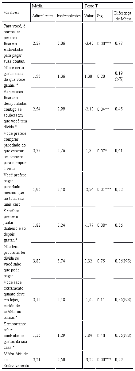Verificou-se que a média das variáveis de atitude ao endividamento foi de 2,21 e 2,50 para o adimplentes e inadimplentes, respectivamente, mostrando que a amostra não tem uma elevada probabilidade de endividar-se, mas que deve atentar-se para elevados níveis de desembolso que possam comprometer sua vida financeira. Em relação aos inadimplentes, estes obtiveram médias estatisticamente significantes superiores de atitude ao endividamento, o que destaca que os beneficiários inadimplentes possuem maior atitude ao endividamento que os adimplentes.