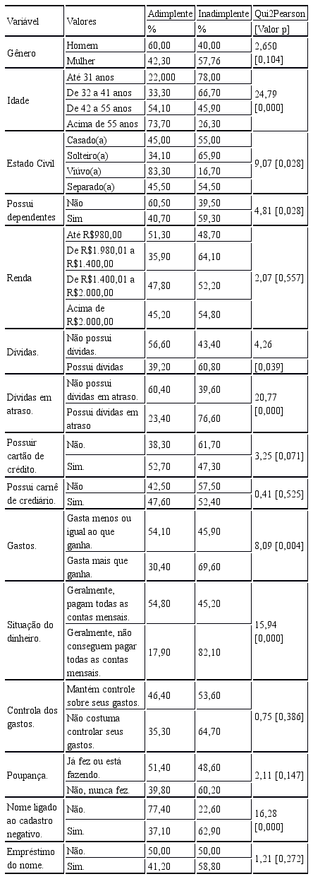 Entre os indivíduos com dependentes há uma proporção maior com a inadimplência (59,3%) do que entre os indivíduos sem dependentes (39,5%), resultado em linha com estudos de Keese (2012), Silva (2011), Godwin (1990) e Lea, Webley e Walker (1995), os quais evidenciam que as famílias com maior número de filhos e dependentes, principalmente crianças, contraem maiores níveis de endividamento, em decorrência do aumento de gastos com situações imprevisíveis como doenças. Entre os indivíduos que possuem dívidas há uma proporção maior com alto nível de inadimplência (60,8%) do que entre os indivíduos que não possuem dívidas (43,4%). Entre os indivíduos que possuem dívidas em atraso há uma proporção maior com alto nível de inadimplência (76,6%) do que entre os indivíduos que não possuem dívidas em atraso (39,6%). Esses resultados são consistes com os estudos de Frade et al (2008) e Marques eFrade (2004).