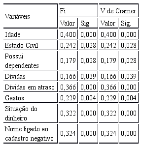 A fim de medir o grau de associação entre as variáveis, foram apresentadas medidas de associação baseadas nas estatísticas do Qui-Quadrado, sendo estas Fi e o V de Cramer, medidas do grau de associação entre duas variáveis categóricas. O Fi é utilizado com tabelas de contigência 2x2 (tabelas que possuem variáveis categóricas e cada variável tem somente duas categorias). O V de Cramer é mais adequado se uma das duas variáveis categóricas apresenta mais de duas categorias (Field, 2009). As medidas de associação normalmente variam entre zero e um, isto é, desde ausência da relação até a relação perfeita entre as variáveis. Os valores baixos indicam uma pequena associação entre variáveis, enquanto que os valores elevados indicam uma grande associação entre as variáveis (Pestana & Gageiro, 2008).