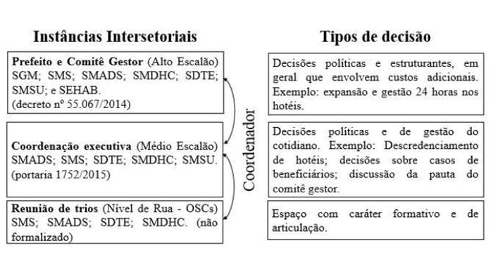 A coordenação do programa passou a integrar o escopo da Secretaria Municipal de Saúde, responsável pela articulação intersecretarial de outras onze secretarias municipais (Assistência e Desenvolvimento Social; Segurança Urbana; Direitos Humanos e Cidadania; Educação; Cultura; Habitação; Desenvolvimento, Trabalho e Empreendedorismo; Esportes, Lazer e Recreação; Desenvolvimento Urbano; Serviços; e Políticas para as Mulheres), duas secretaria estaduais (Saúde e Justiça e Defesa da Cidadania), além do Fórum Intersetorial de Drogas e Direitos Humanos e especialistas convidados (São Paulo, 2014).