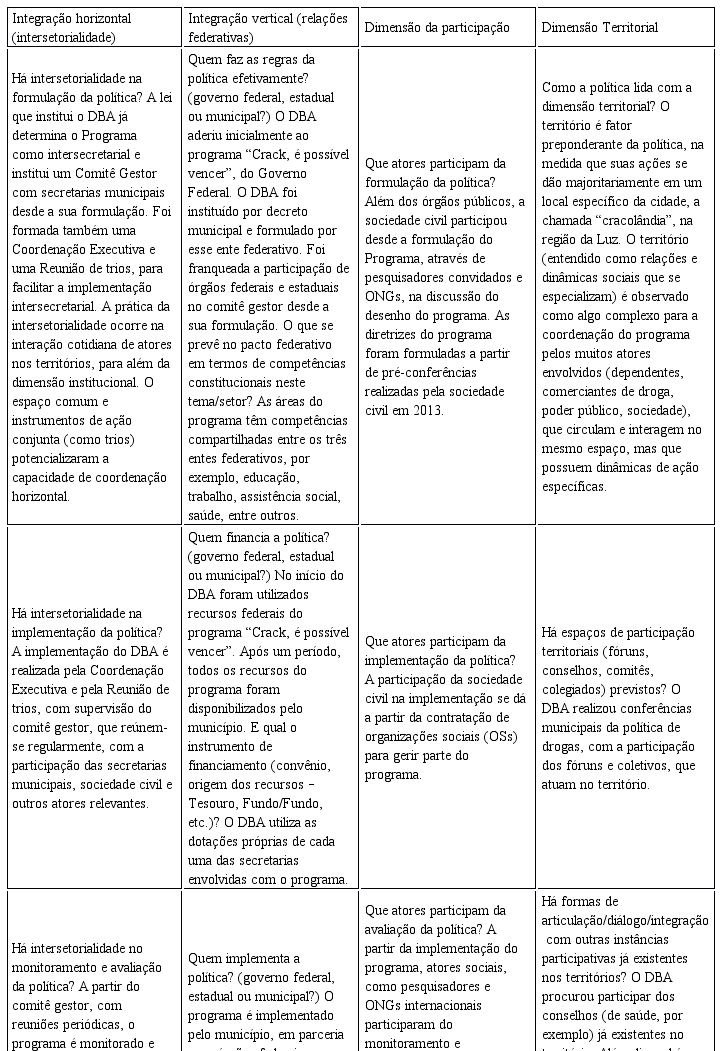 Como dito acima, a análise do Programa “De Braços Abertos” será realizada a partir do ferramental metodológico dos arranjos institucionais, desenvolvido por Lotta e Favareto (2016), a partir de quatro dimensões ou categorias de análise: intersetorialidade, relações federativas, participação de atores não estatais e aspectos territoriais (Lotta & Favareto, 2016).