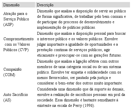 Em trabalho posterior, a partir de tais “motivos” e da noção de auto sacrifício, Perry (1996) identificou e operacionalizou um conjunto de vinte e quatro (24) itens distribuídos em quatro dimensões distintas para mensurar a MSP: (i) Atração para a elaboração de políticas públicas, (ii) comprometimento com o interesse público/dever cívico, (iii) compaixão e (iv) auto sacrifício (Perry & Wise, 1990; Camilleri, 2007; Wright & Pandey, 2008).