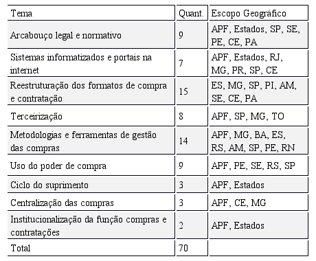 A categorização foi ajustada de forma interativa, no decorrer do exame dos trabalhos selecionados, para chegar à sistematização final de um conjunto de temas que situasse as mudanças e inovações dentro da perspectiva estratégica de institucionalização da função compras públicas no Brasil. Dessa forma, o balanço apresentado destaca não somente a frequência dos temas que foram objeto de experiências inovadoras, muitas delas alcançando disseminação nacional, como também as deficiências e limitações que indicam possíveis itens de uma agenda para o fortalecimento da área.