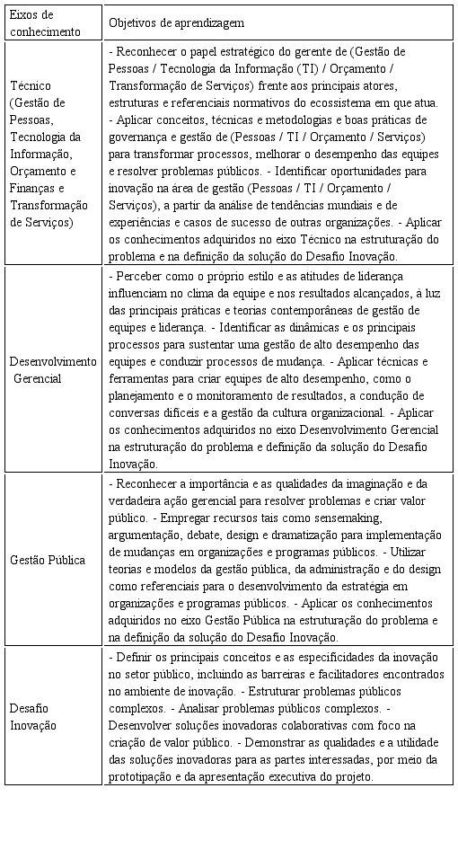 Posteriormente, foram definidos os objetivos de aprendizagem, baseados nos resultados dos grupos focais, que identificaram os principais problemas dos sistemas estruturadores da administração. O Quadro 2 abaixo apresenta os objetivos de aprendizagem de cada eixo.