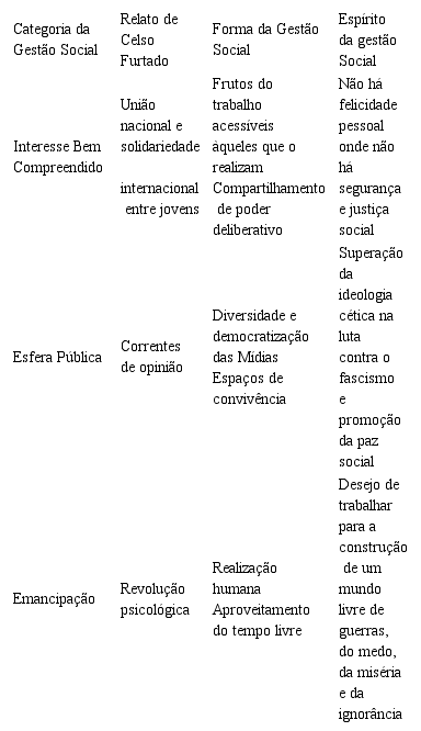 A seguir apresentamos o quadro síntese dessa análise. Nele as categorias da Gestão Social são relacionadas com os relatos de Celso Furtado e desdobradas em “forma” (aspectos institucionais) e “espírito” (aspectos culturais) da Gestão Social.