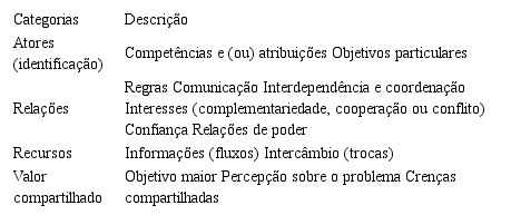 Para o presente estudo, elaborou-se o quadro teórico ilustrado no Quadro 1, a partir das categorias de análise indicadas pela literatura revisada (Bispo & Santos, 2017; Fleury, 2005; Fleury & Ouverney, 2007; Frey et al., 2005; Koppenjan & Klijn, 2004).