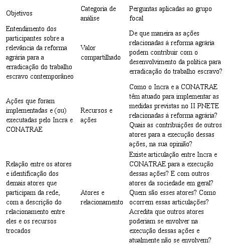 Além da análise de conteúdo de documentos oficiais, foi utilizada também a técnica do grupo focal para coleta de dados primários, definida como um tipo de entrevista realizada pelo pesquisador com os participantes em grupo (Creswell, 2010). Os grupos de foco reúnem dados relativos às opiniões de um grupo de pessoas que está envolvido em uma mesma situação (Collis & Hussey, 2005) e consistem em entrevistas semiestruturadas que utilizam abordagem exploratória em pesquisas qualitativas (Hair et al., 2005). Assim, o grupo focal realizado possuiu como objetivo obter informações e opiniões acerca do desenvolvimento da reforma agrária como instrumento da política pública para erradicação do trabalho escravo, conforme ações previstas no II PNETE, e sobre a efetiva atuação dos atores envolvidos responsáveis pela execução dessas ações.