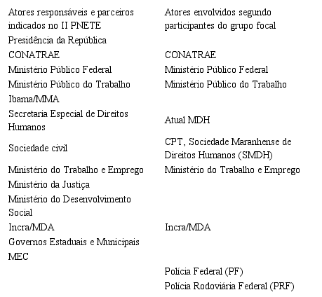 Observa-se que a Presidência da República, Ibama, Ministério da Justiça, Ministério do Desenvolvimento Social não foram mencionados pelos participantes do grupo focal, bem como nenhum governo estadual ou municipal, enquanto a Polícia Federal e a Polícia Rodoviária Federal foram mencionadas, embora não estejam indicadas no II PNETE como atores responsáveis ou parceiros pela execução das ações.
