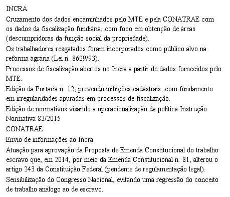 “Na parte fundiária propriamente dita, a correlação, o cruzamento de dados utilizados da questão das ações de fiscalização. Eu não sei bem qual foi o nível de formalização disso daí, eu acho que chegou a ter algum tipo de instrumento, não sei se diretamente com a CONATRAE, mas com o Ministério do Trabalho, um acompanhamento do recebimento das indicações das ações de resgate pra fazer batimento com a questão fundiária, sempre muito no foco da obtenção”.